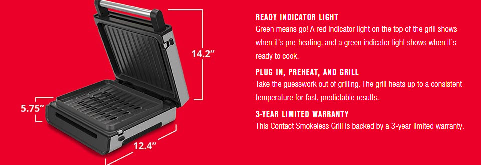 The Contact Smokeless Grill makes it easy to create quick weeknight meals the whole family will love. Juicy burgers, sizzling steaks, and so much more fit easily on the 90 sq. in. cooking surface.