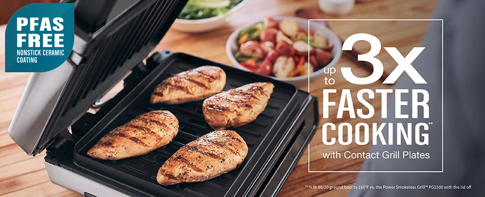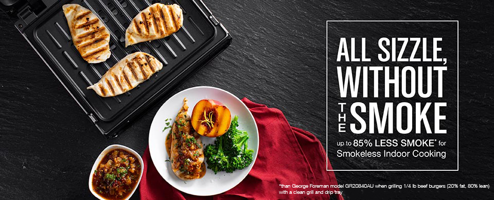 GEORGE FOREMAN® Grills presents: All sizzle without the smoke! The Contact Smokeless Ready Grill makes indoor grilling fast, delicious, and smokeless! Just plug in, preheat, and you’re ready to cook your favorite meals up to 3X faster**. Give burgers a try — they’re ready in just six minutes***!