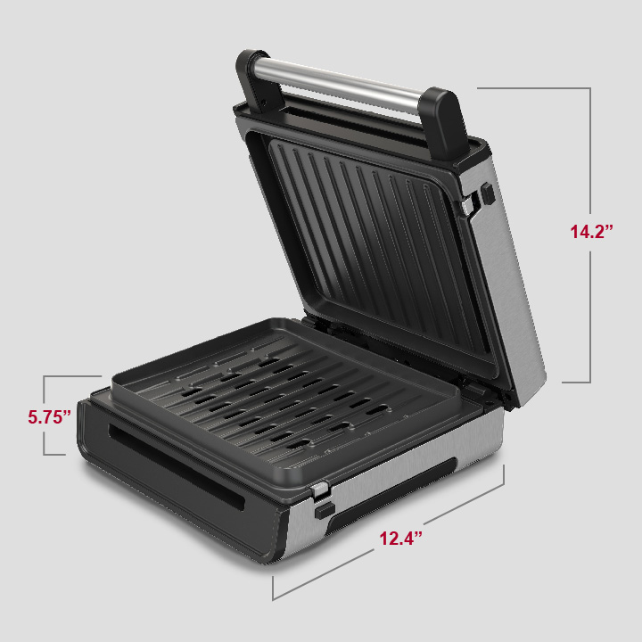 The grill plate and drip tray are removable and dishwasher-safe for simplified cleanup.
