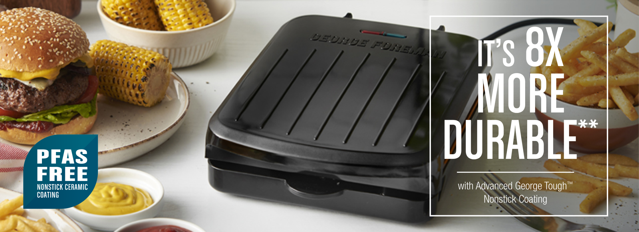 - 8x More Durable** Advanced George Tough™ Coating – Helps protect your grill plates from scratches and abrasions during cleaning to help prolong the life of your appliance.
